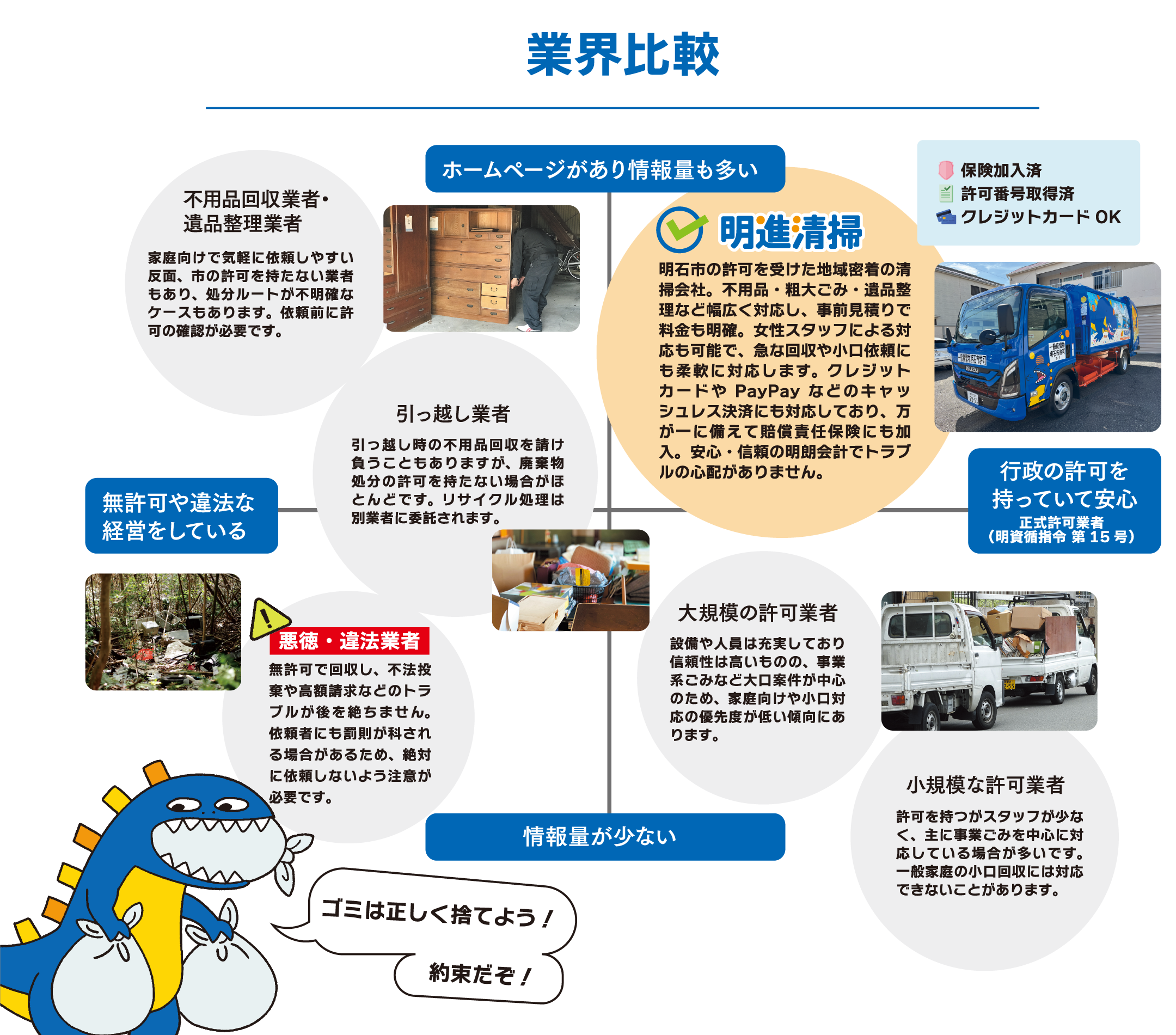 明進清掃は明石市の一般廃棄物収集運搬業の許可を取得している許可業者で、適正な不用品回収や粗大ごみの回収・処分を行っています。 近年は無許可業者による不法投棄やお客様とのトラブルも多発しておりますが、明進清掃は法令順守を徹底し、明石市の皆様に信頼いただけるサービスを提供しています。また、料金も適正価格をモットーとし、安心の無料見積・無料相談なので、安心してご依頼いただけます。